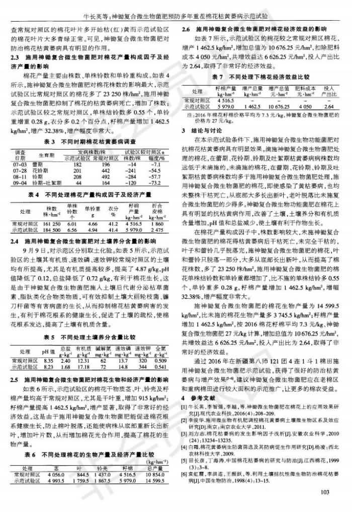 神锄复合微 生物菌肥预防多年沉茬棉花枯黄萎病 示范试验